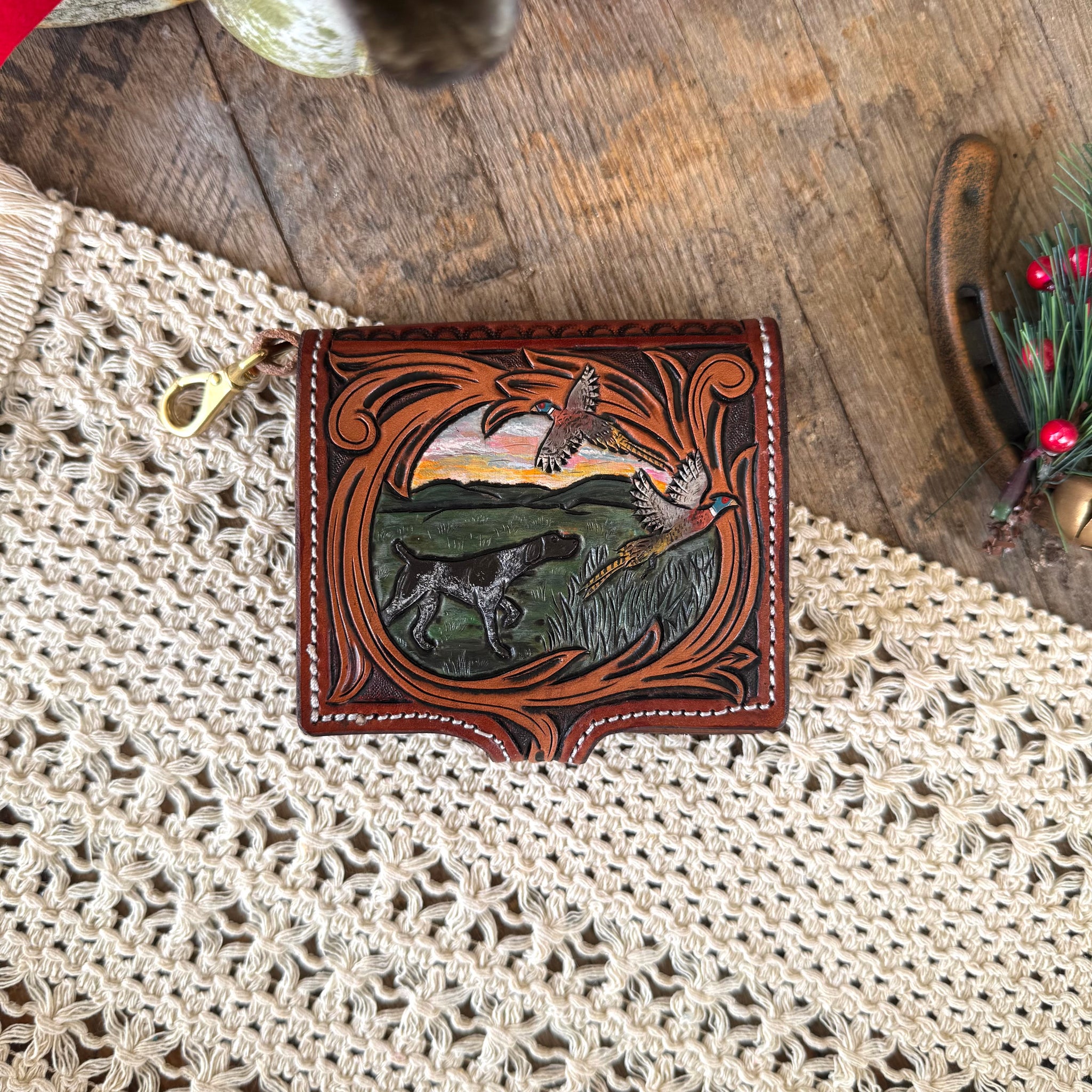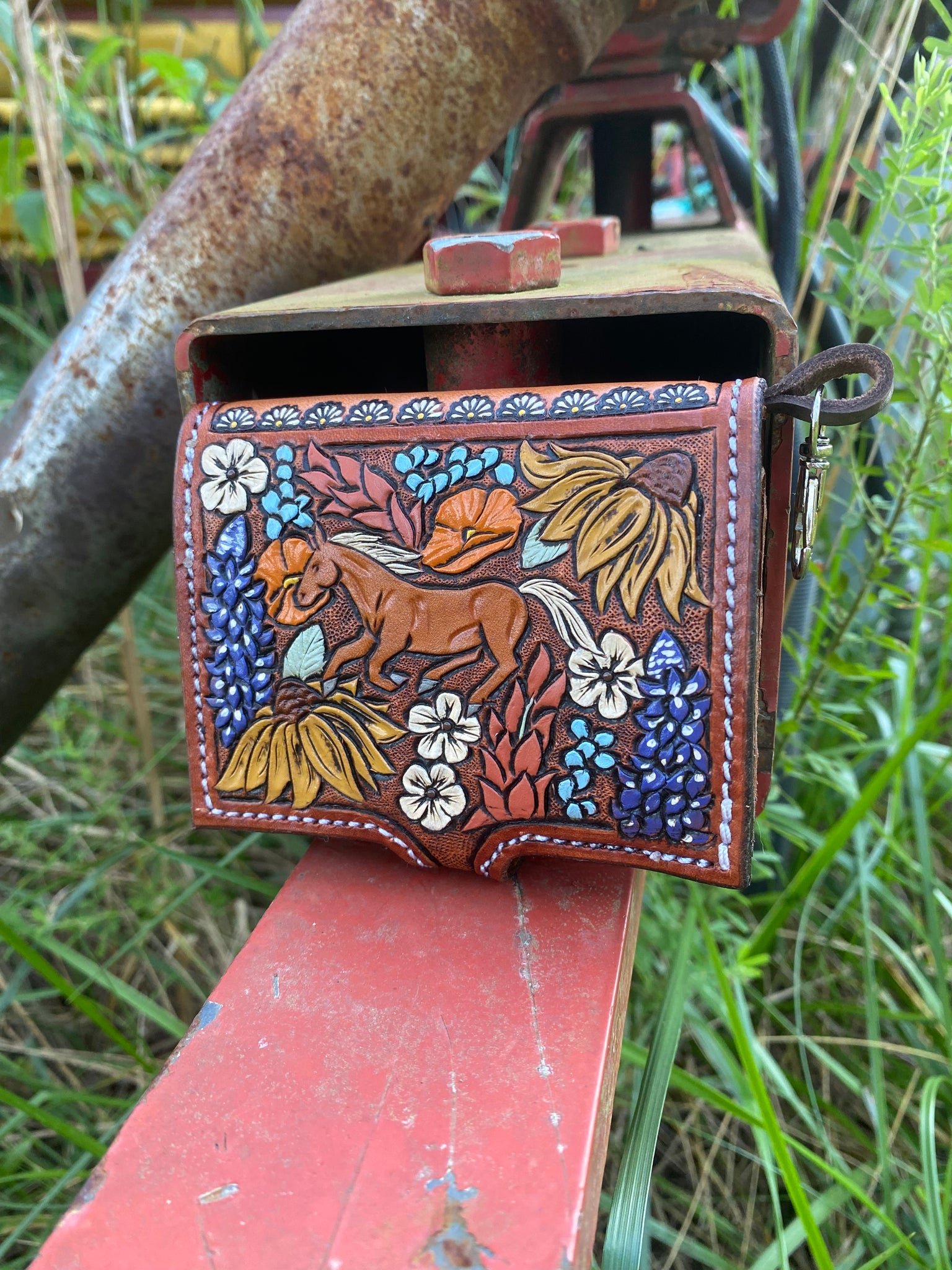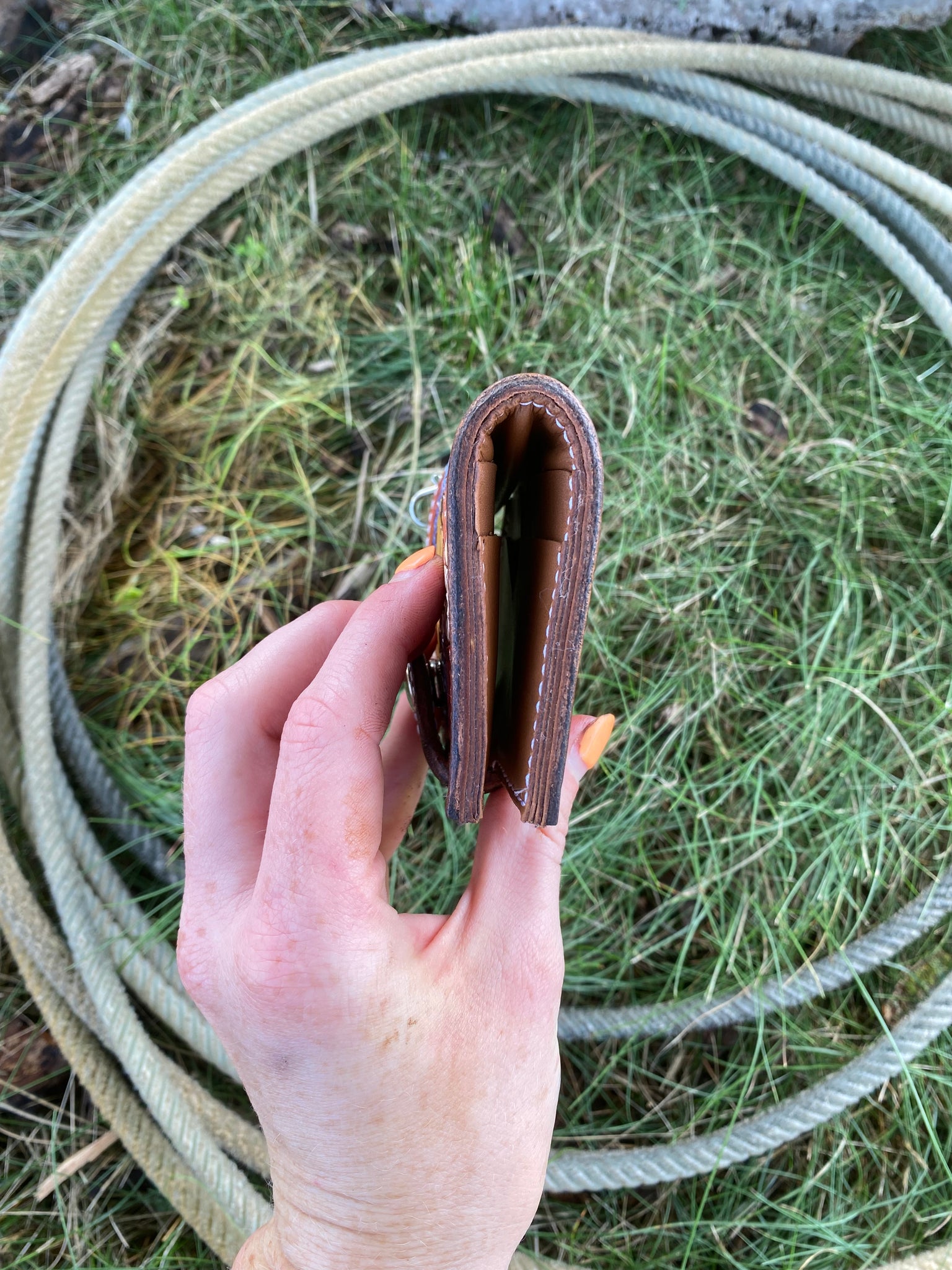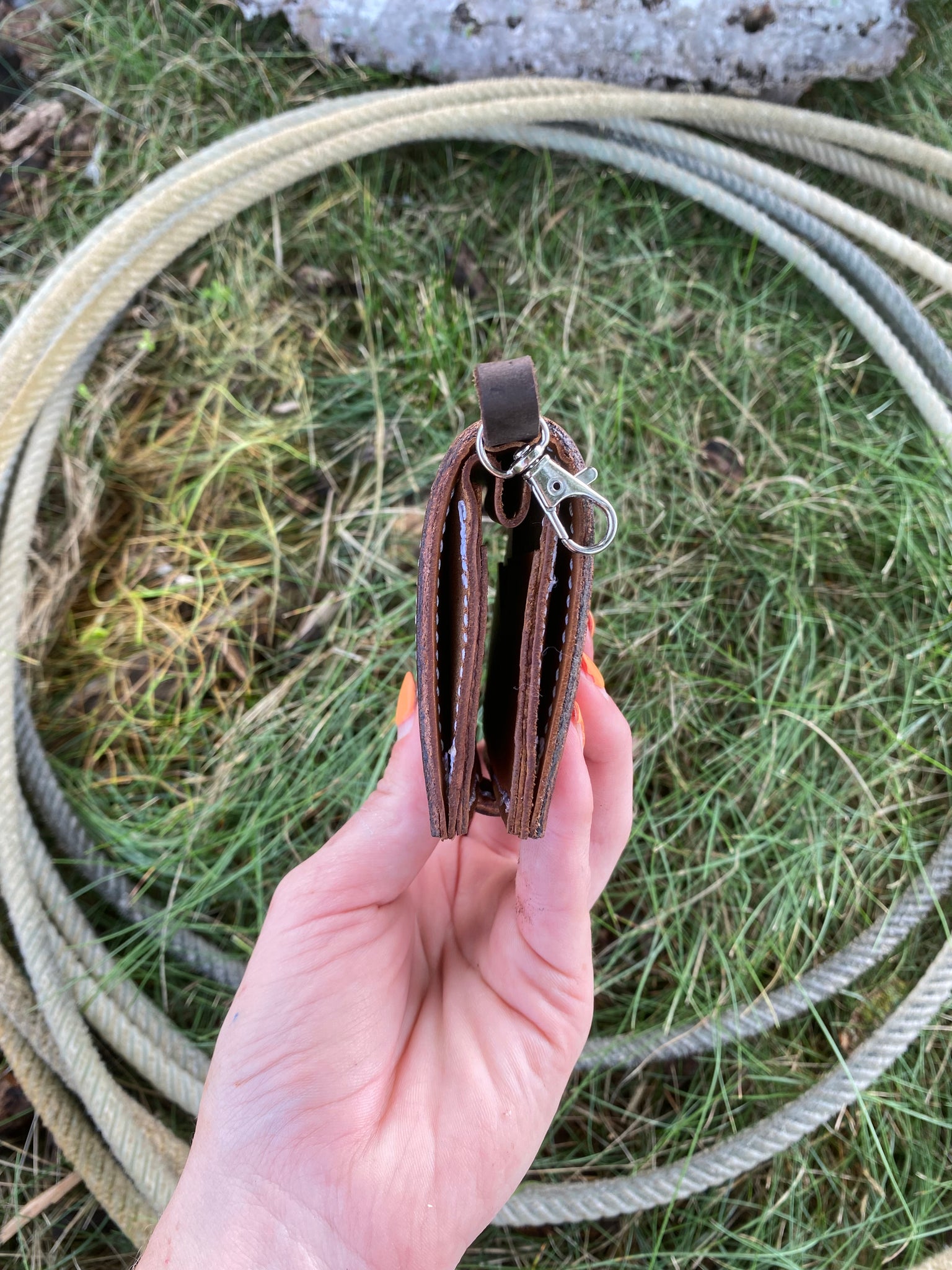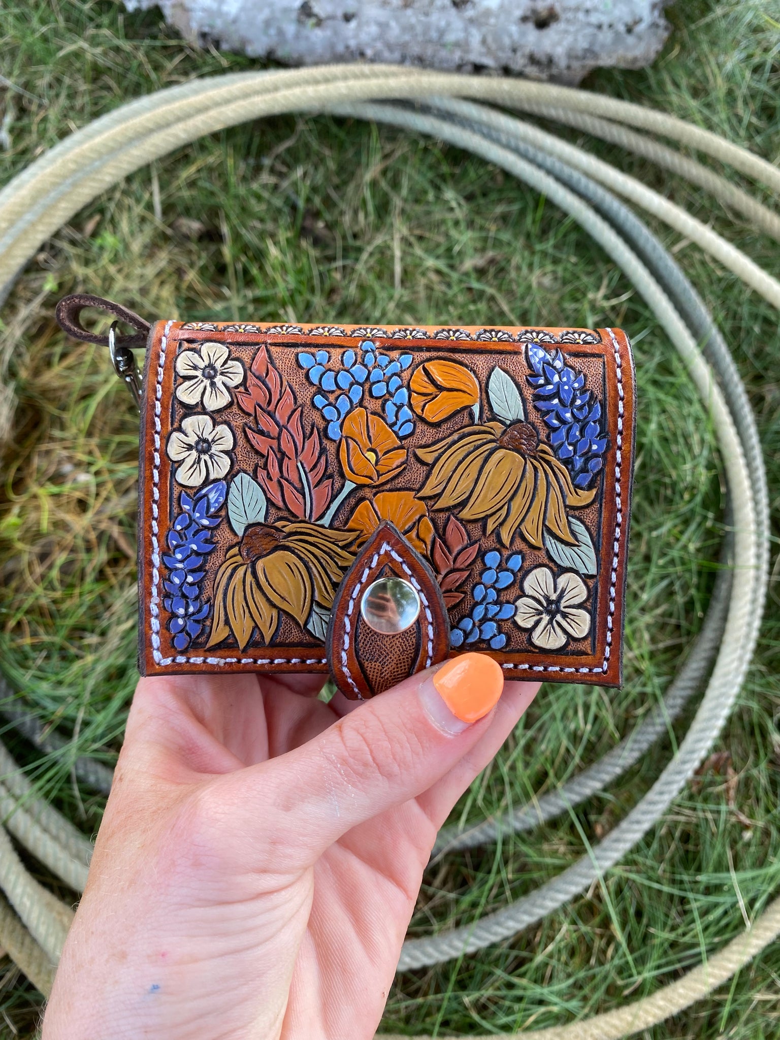This is a DEPOSIT for a mini wallet. When you purchase this slot, send an email to mtnsidehide.customorders@gmail.com to discuss what you want and final price. Totals range from $300-$425 depending on details