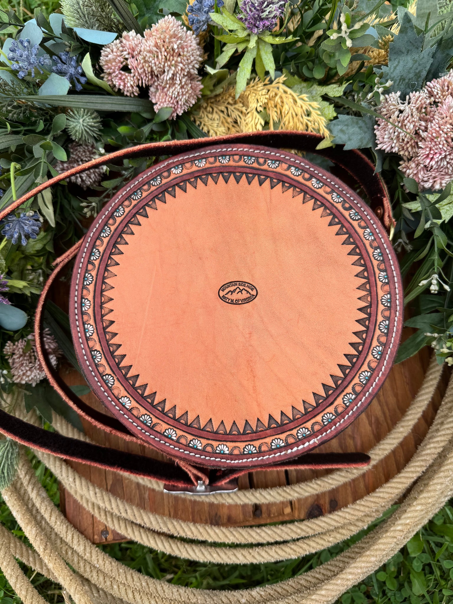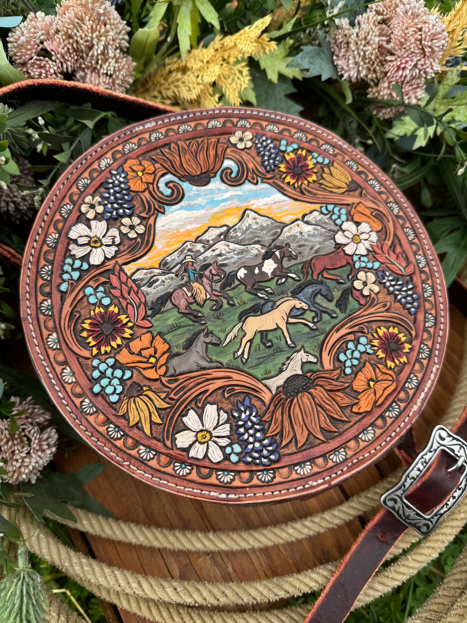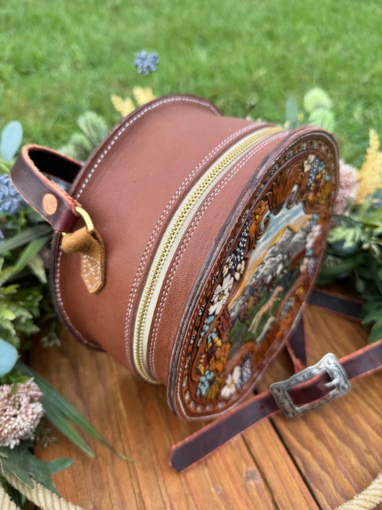 This bag is an 8” diameter, the drawing, tooling and painting took approximately 20 consecutive hours alone. Inside is a bright turquoise with a card pocket. Perfect for the end of summer festivities 🌸🌻🌼 it’ll be hard to let her go! But she needs a good home 🩵