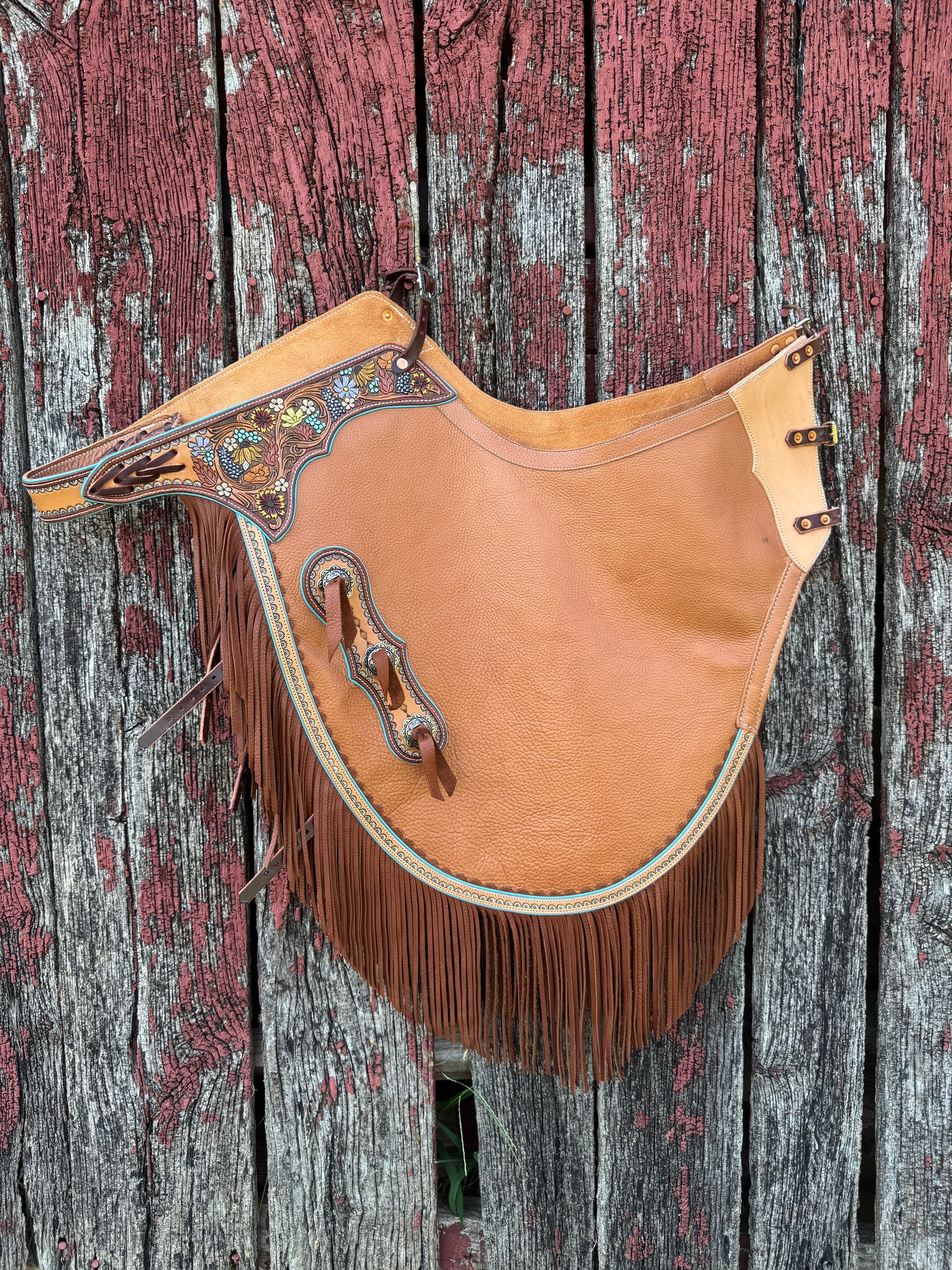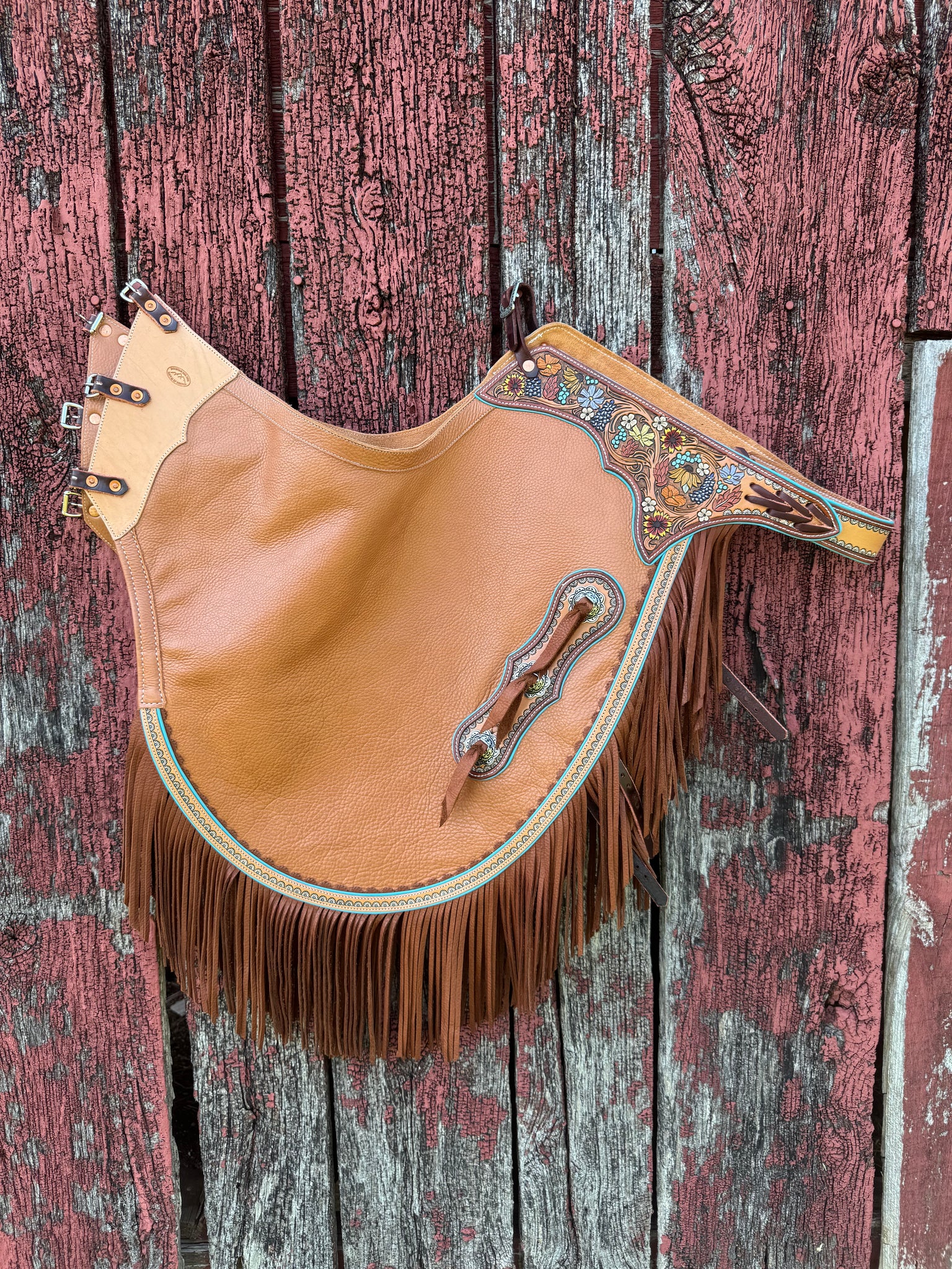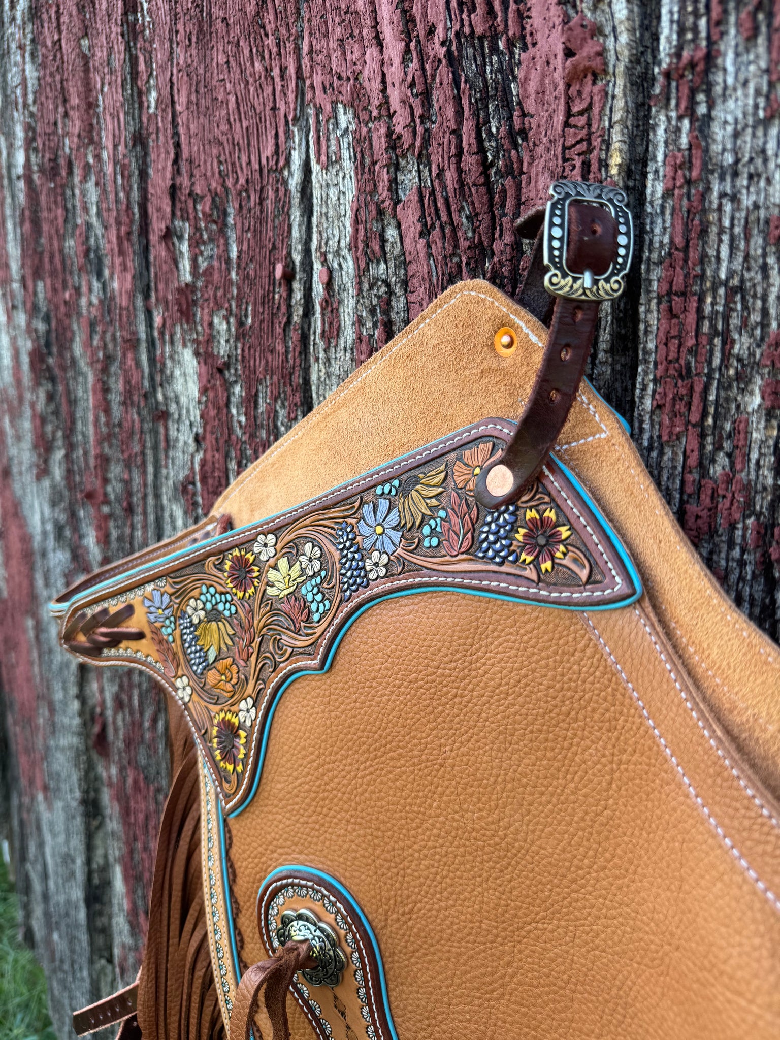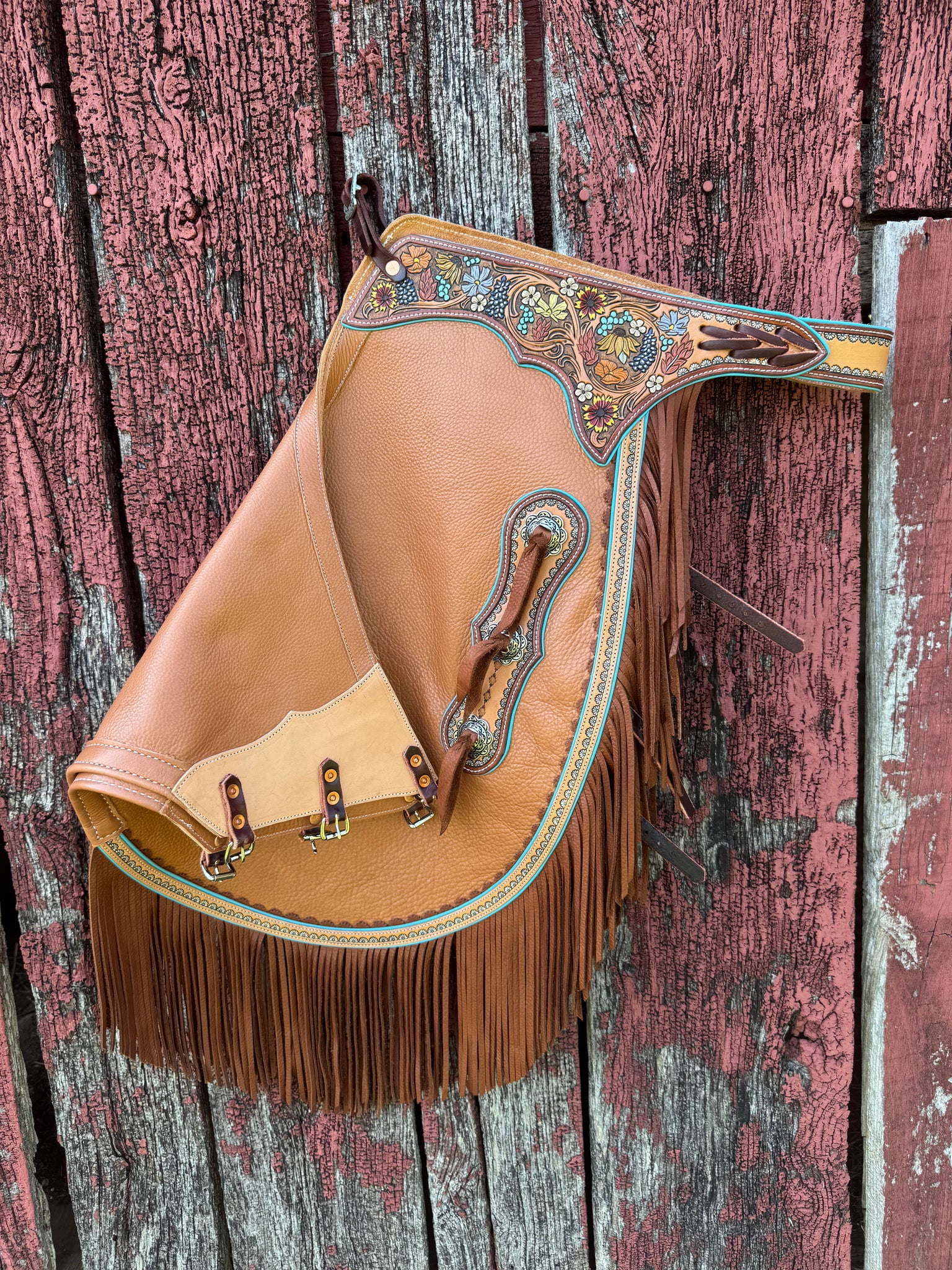 One-of-a-kind wildflower chinks- handmade down to every detail, made with a top quality grain chap leather and full of character.