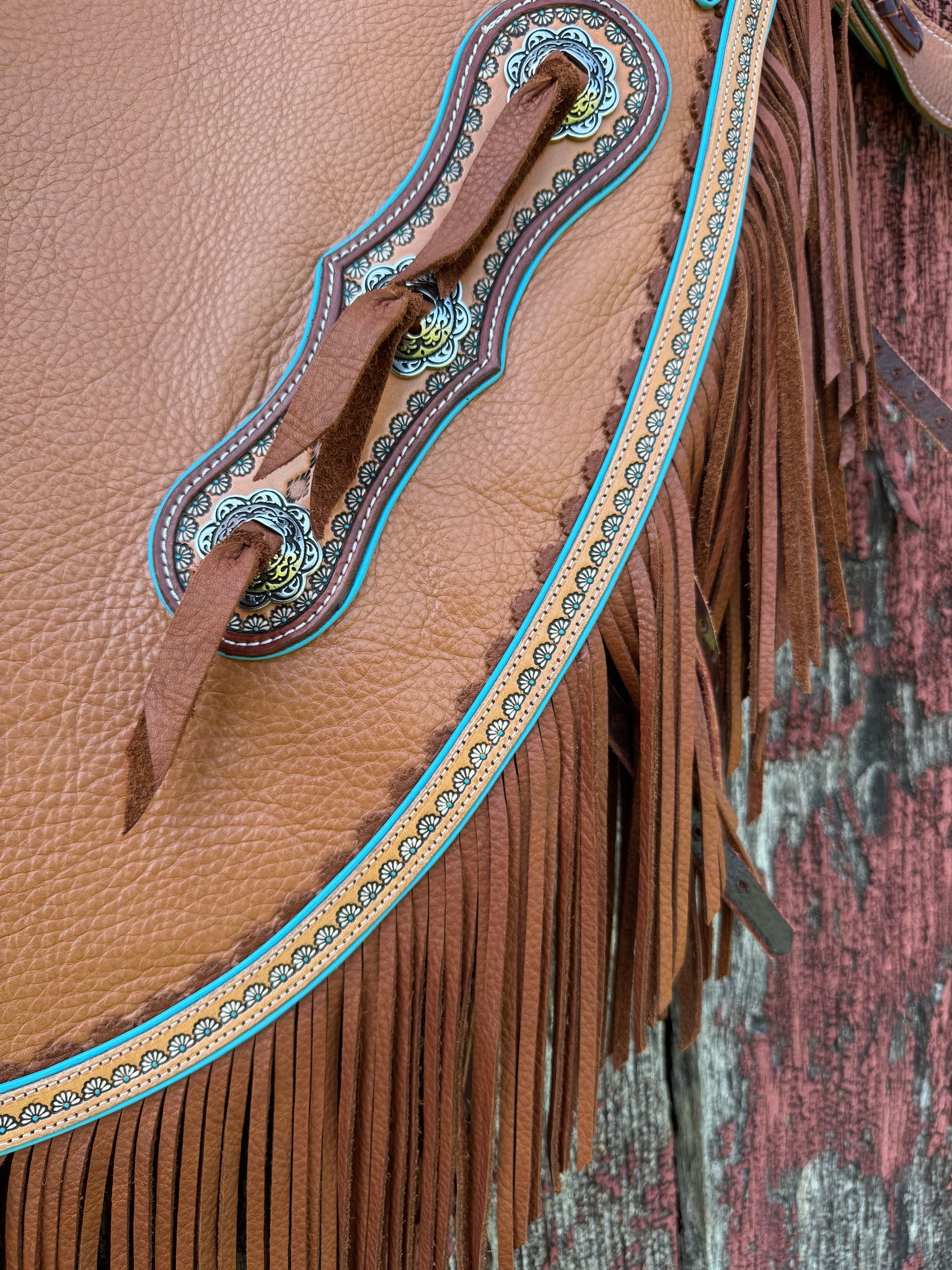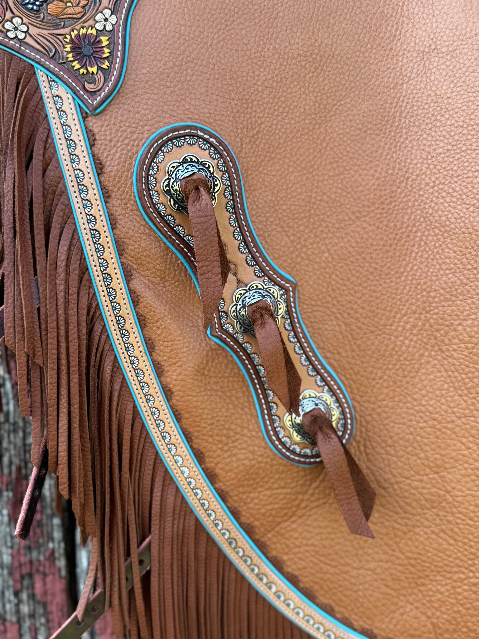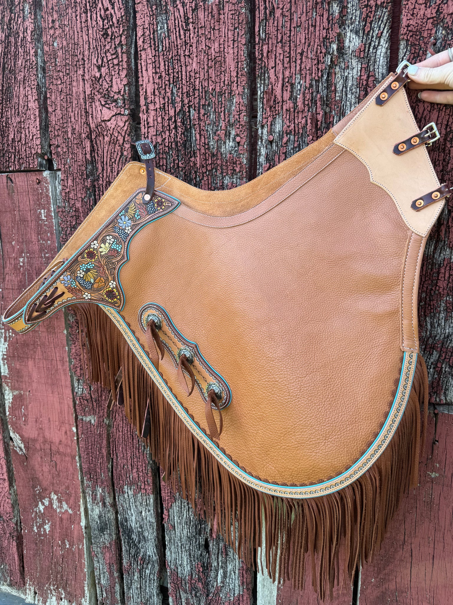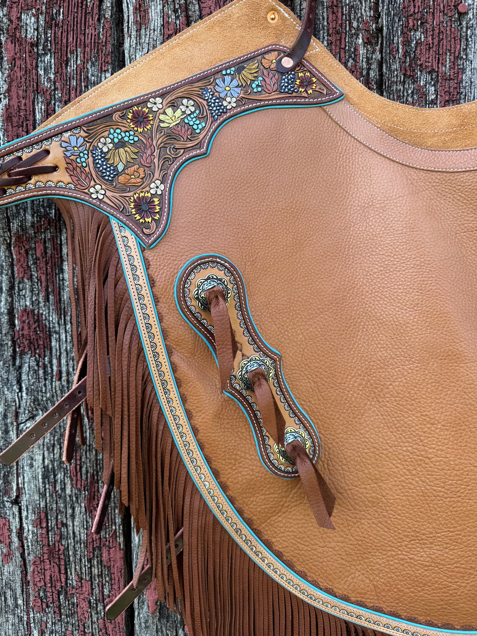 One-of-a-kind wildflower chinks- handmade down to every detail, made with a top quality grain chap leather and full of character.